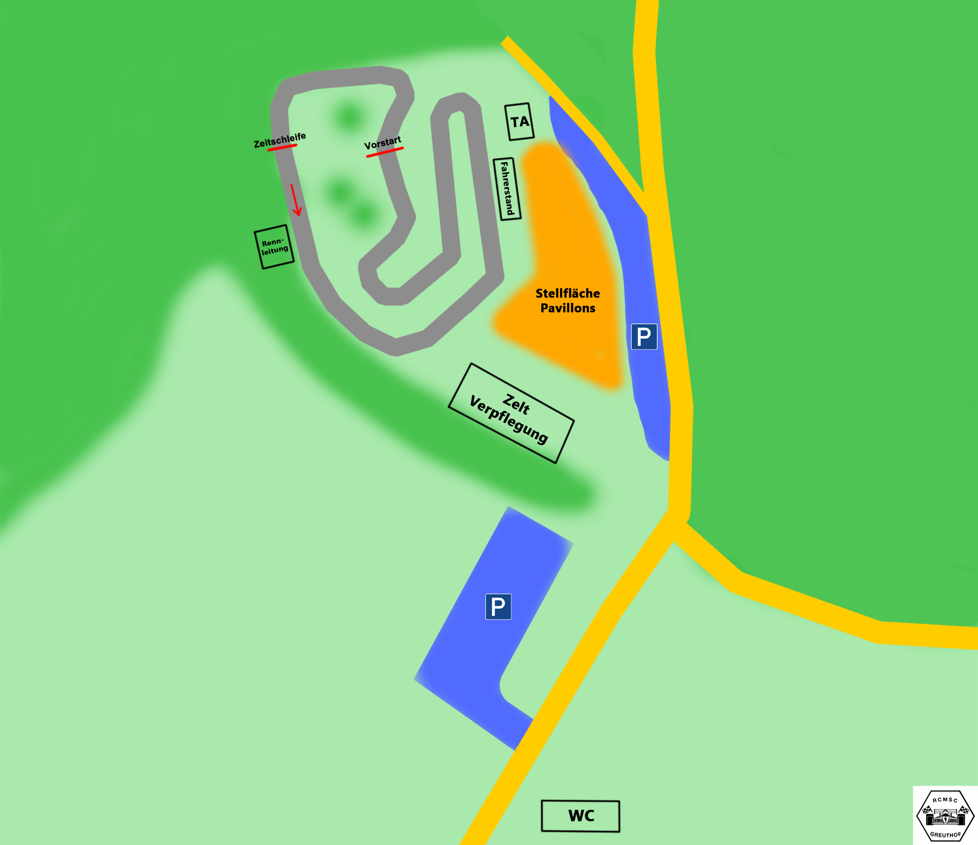 Die Parkplatzsituation an unserer Strecke ist bei größeren Veranstaltungen aufgrund der zur Verfügung stehenden Flächen meist etwas angespannt. Die geschotterte Fläche zwischen Waldweg und der Pavillonstellfläche kann zum Parken benutzt werden. Bitte einigermaßen platzsparend parken und darauf achten, dass der Weg hinter den abgestellten Fahrzeugen frei bleibt. Zusätzlich kann die Wiese unterhalb als Parkplatz genutzt werden.