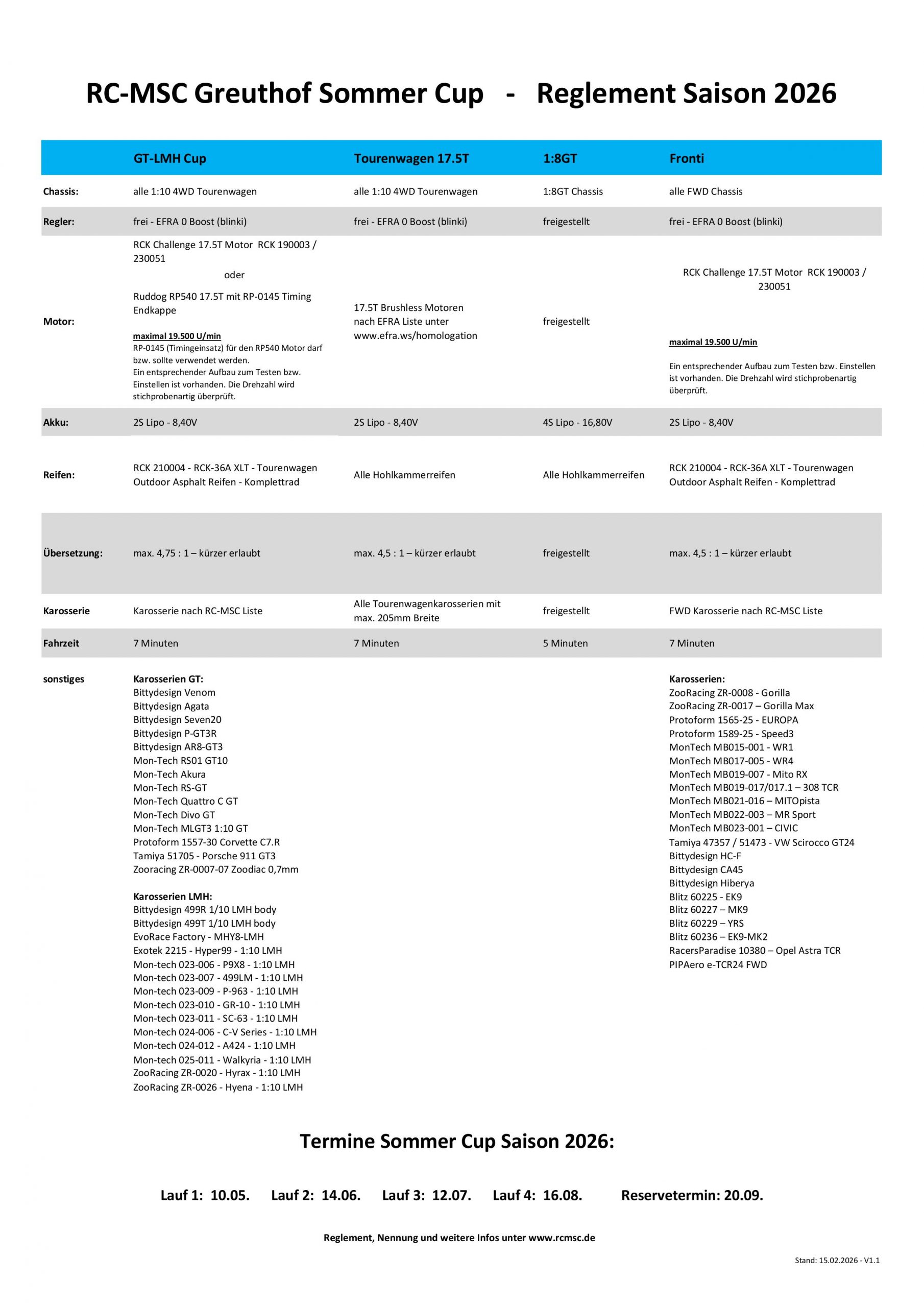 - Tourenwagen 17.5T und 1:8GT bleiben unverändert erhalten